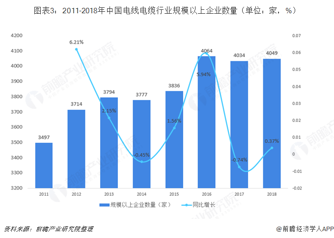我国电线电缆产业发展已经具有较长时间的历史,形成了成熟的产业链和完整的工业体系,参与电线电缆制造的企业数量较多。根据国家统计局数据显示,2011-2018年,我国电线电缆行业企业数量呈波动上升变化。2018年,我国电线电缆行业企业数量有10000余家,规模以上企业为4049家,较上年增加15家。