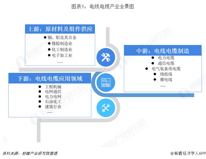 从产业链角度来看,电线电缆产业上游主要为提供制造电线电缆产品原材料的基础材料行业,如铜、铝及其合金;制造交联绝缘套及护套料的橡胶行业,聚乙烯、聚氯乙烯化工行业等;中游包括提供电力电缆、通信电缆、电气装备用电缆及裸电线、绕组线等其他类型电缆的电线电缆生产制造企业;下游主要为对电线电缆有需求的行业,如工程机械、通信行业、电力行业及建筑行业等。