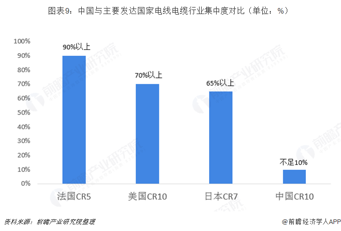 虽然我国电线电缆行业整体规模位居世界世界首位,但在行业集中度方面与发达国家有较大差距,发达国家的电线电缆行业经过多年发展,特别是面对原材料价格波动,小企业逐渐退出市场,产业集中度大幅提高:美国前10名线缆制造商(如通用、百通、康宁、南线等)占据了市场份额的70%左右;日本7大线缆企业(如古河、住友、滕仓、日立、昭和等)占市场份额的65%以上;法国五大线缆企业(耐克森、新特等)包揽了法国市场的营业额,占据了法国市场份额90%以上。而我国前十线缆企业仅占据中国市场份额不足10%,龙头企业发展潜力巨大。
