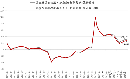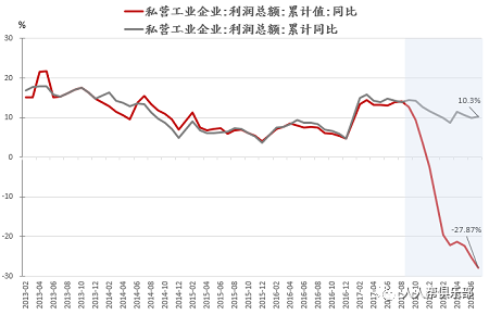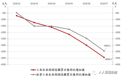 我们可以得到一个初步的结论,在规模以上统计样本中消失的企业,主要是受供给侧改革冲击的私营企业。那么,冲击的影响有多大呢?消失的企业利润反映在利润总额累计值的变化当中。今年1-7 月,私营企业的利润总额的变化(累计减少3946.5 亿),超过全部工业企业利润总额逐月的变化(累计减少3443.1 亿),而且逐月来看拟合度几近完美(图六)。这就说明在样本中消失的私营企业,几乎可以解释“幸存者偏差”(即累计同比与累计值同比的偏差)的全部。