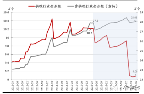 过去两年,宏观经济政策的一条主线是“供给侧改革”,包括行政去产能和环保巡查下的各种停产限产措施。我们的第一个发现是,那些在规模以上统计样本中消失的企业主要集中在受供给侧改革影响的11 个行业之中,2016 年初至2018 年中,供改行业企业单位数减少超过1.1 万家,缩减幅度占供改行业企业总数的11.1%。其中钢铁、煤炭企业数量缩减的幅度分别超过50%、30%,可见行政力度之大。而在此期间,非供改行业企业单位数上升了约1,500 家,升幅约为0.5%。