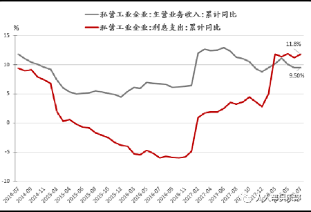 另一个证据是,伴随着资产负债率的快速上升,私营企业的利息开支加大,同比利息支出上升11.8%,结合主营业务收入增长的回落,幅度可谓惊人(图八)。