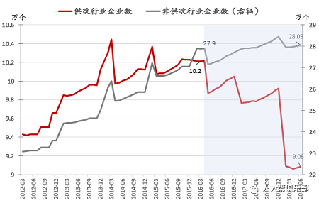 资料来源:Wind、招商银行研究院、招银国际研究(供改行业为受供给侧改革影响的行业,包括煤炭开采、黑色矿开采、有色矿开采、非金属矿开采、造纸、石化炼焦、化工、化纤、黑色冶炼、有色冶炼、非金属矿物制品等11 个行业。非供改行业为除上述11 个行业外的其他29 个行业)