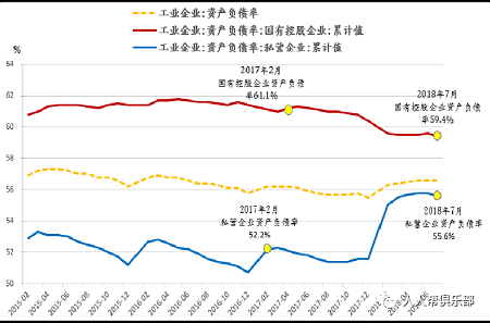 四、去谁的杠杆?即使是幸存者,私营企业依然不幸我们当然也有兴趣知道,那些在规模以上样本中幸存下来的私营企业,他们的经营状况如何?大家都知道,今年的另一个重要的政策表述是“去杠杆”,我们就来看看企业的资产负债率的变化(图七)。从资产负债率看,一直以来是国有企业高杠杆,私营企业低杠杆。但是,2017 年以来的变化出乎意料:国有企业资产负债率略有下降;从61.1%下降至59.4%;私营企业资产负债率明显上升,从52.2%上升至55.6%。