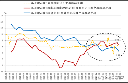 最后,我们再来看看构成国内生产总值(GDP)的工业增加值增长数据。历史显示,得益于市场化改革进程,私营企业的工业增加值增速一直高于国有企业,但是情况从2016 年开始突然发生了变化:国有企业工业增加值按月增速开始回升,而私营企业在五年间整体维持增加值增速持续下行的态势。2017 年6 月开始出现“死亡交叉”,国有企业工业增加值当月同比增速开始超过私营企业。