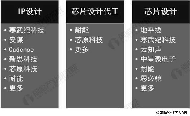 目前国内人工智能芯片设计企业的商业模式分为IP设计、芯片设计代工、芯片设计三种类型。IP设计相对于芯片设计是在更顶层的产业链位置,以IP核授权收费为主;芯片设计代工和制造业的代工一样,提供代工设计服务的企业,并不能再产品上贴上自己的标签,也不能对外宣布该产品为自己设计的芯片;大部分的人工智能新创企业是以芯片设计为主,但目前国内只有少数人工智能芯片设计企业会进入传统芯片企业的产品领域,如寒武纪与英伟达竞争服务器芯片市场、地平此案与英伟达及恩智浦竞争自动驾驶芯片市场,其余是在物联网场景上布局(如提供语音辨识芯片的云知声、提供人脸辨识芯片的中星微电子、提供边缘计算芯片的耐能科技)。