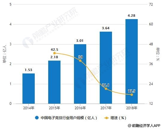 在政策热、赛事热、投资热等因素推动下,我国电竞产业链快速扩充并不断完善,市场规模迅速扩大,未来发展一片利好。据前瞻产业研究院发布的《中国电子竞技行业市场前景预测与投资战略规划分析报告》统计数据显示,2014年中国电子竞技行业用户规模已达1.53亿人,2016年中国电子竞技行业用户规模突破3亿人,到了2017年中国电子竞技行业用户规模增长至3.64亿人,同比增长21.1%。截止至2018年底中国电子竞技行业用户规模达到了4.28亿人,同比增长17.5%。