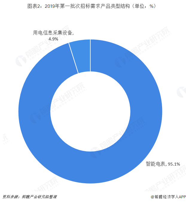 在国家电网2019年第一次电能表及用电信息采集设备招标中,国家电网共计采购设备230包,所有类型设备总需求4016.61万只,同比增长70.45%,其中智能电表设备为本次招标采购的重点设备,智能电表产品合计需求3821.2万只,占全部设备总量的95.1%。