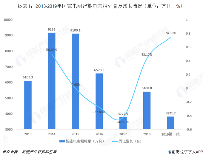 2019年6月,国家电网公告了2019年第一次电能表及用电信息采集设备招标中标结果。根据招标中标结果显示,智能电表招标量有所增长,随着我国智能电网建设的快速实施以及电能表轮换工作的开展,作为智能电网用电环节的重要组成部分,智能电表的需求将在未来一段时期内持续增长。2019年国家电网第一批次对智能电表的招标量达到3821.2万只,较2018年第一批次招标量同比上升74.38%;2019年第一批次智能电表的招标数量已经超过上年智能电表招标总量的70%。