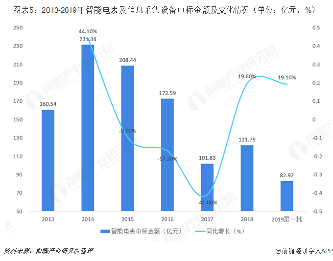 从中标金额来看,2014年为智能电表及用电信息采集设备的高峰期,中标金额达到峰值,为231.34亿元,随后智能电表及用电信息采集设备市场趋于饱和,中标金额逐渐下降。2017年,由于更大范围普及和换表需求,中标金额又开始呈增长趋势,2019年第一批次中标金额为82.92亿元,较上年同比增长19.1%,预计2019年我国智能电表需求量及市场规模将进一步扩大。