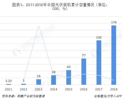 2018年开始,由于光伏发电成本不断下降以及光伏补贴缺口的出现,度电补贴开始下调,531新政的到来加速了行业洗牌和技术降本进程,2018年我国光伏累计装机容量174GW,新增装机44GW,在全球110GW的新增装机中占比40%,冠居全球。