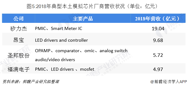 2018年,矽力杰、昂宝、圣邦股份、福满电子的营收分别达19.04亿元、9.68亿元、5.72亿元、4.97亿元。