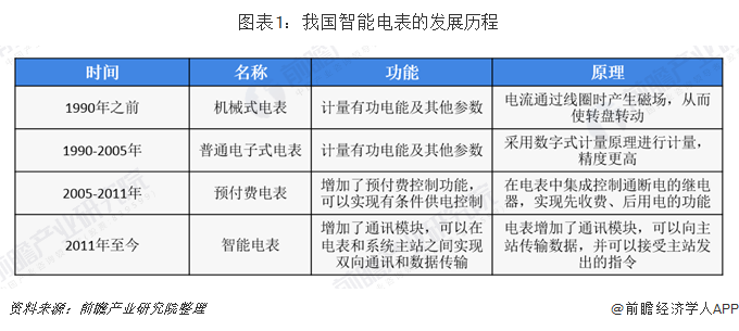 智能电表是智能用电的重要组成部分,是实现双向互动智能用电的“末端神经”,支持双向计量、自动采集、阶梯电价、分时电价、冻结、控制、监测等功能。另外,智能电能表还可以为用户提供很多用电服务,包括分布式电源计量、互动服务、智能家居、智能小区等。我国电表行业经历过机械制电表、普通电子式电表、预付费电表以及现在基本全面普及的智能电表阶段。