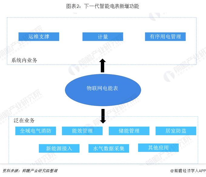 下一代智能电表将在传统的计量业务之外,搭载更多的功能。可实现系统内业务(运维支撑、计量、有序用电管理)和泛在业务(全域电气消防、新能源接入、能效管理、水气数据采集、居室防盗、储能管理、其他应用等)。下一代智能电表应用物联网技术,是“两网”建设的关键智能终端产品之一,对于电网实现信息化、 自动化 、智能化具有重要支撑作用。随着“泛在电力物联网”建设的推进和落实,以及电能表存量更换需求推动,下一代智能电表将有广阔的市场空间。
