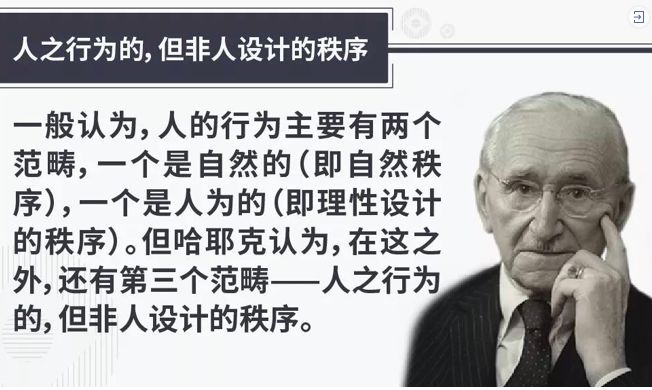 第三种秩序——人之行为的,但非人设计的秩序,它既不是自然的,也不是人为的,它与人有关系,但又不是人为设计的,它是一代又一代的人为了适应环境、不断的互动、不断的修改、慢慢被人认可、接纳形成的。它介于理性和本能之间。比如语言,语言如此复杂精密,很难说是由哪个人设计的,它是由无数人参与,慢慢进化、自然选择的结果。