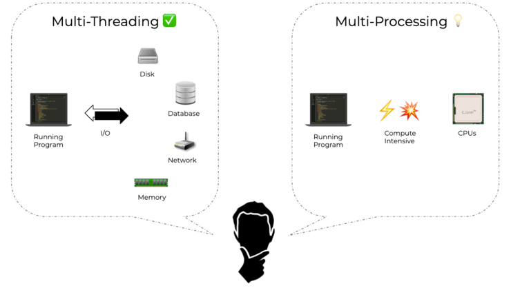 如果程序是 CPU 密集型的,并且不需要进行任何 IO 或用户交互,那么多处理就比线程更加突出。例如,任何一个只处理数字的程序都可以使用多处理得到极大的加速;事实上,线程可能会减慢它的速度。一个有趣的实际例子是 Pytorch Dataloader,它使用多个子进程将数据加载到 GPU 中。