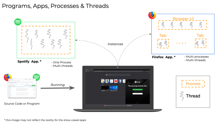 例如,让我们回想一下正在你的计算机上运行的程序。你可能正在浏览器中阅读本文,浏览器可能打开了多个选项卡。你也可以同时通过 Spotify 桌面应用程序收听音乐。浏览器和 spotify 应用程序是不同的进程;每个进程都可以使用多个进程或线程来实现并行性。浏览器中的不同选项卡可能在不同的线程中运行。Spotify 可以在一个线程中播放音乐,在另一个线程中从 Internet 下载音乐,并使用第三个线程显示图形用户界面。这称为多线程。对多个进程进行多处理也可以做到这一点。事实上,像 chrome 和 firefox 这样的大多数现代浏览器使用多处理,而不是多线程来处理多个选项卡。