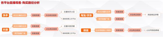 从用户观看、购买路径上看,快手、抖音、淘宝、微信中都可以实现平台内一站购买,如果直播产品是第三方平台链接,就需要跳转到另一个APP中。从商品种类、数量以及购买体验感来看,淘宝占据了一定优势。