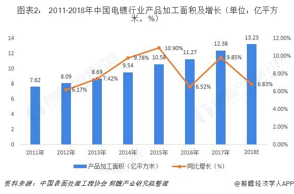 根据中国表面处理工程协会数据,2017年,我国规模以上的电镀企业(含电镀车间)在2万家左右,产品加工面积约12.38亿平方米,同比增长6.83%,连续三年维持在10亿平方米以上。2018年,电镀行业产品加工面积约为13.23亿平方米。