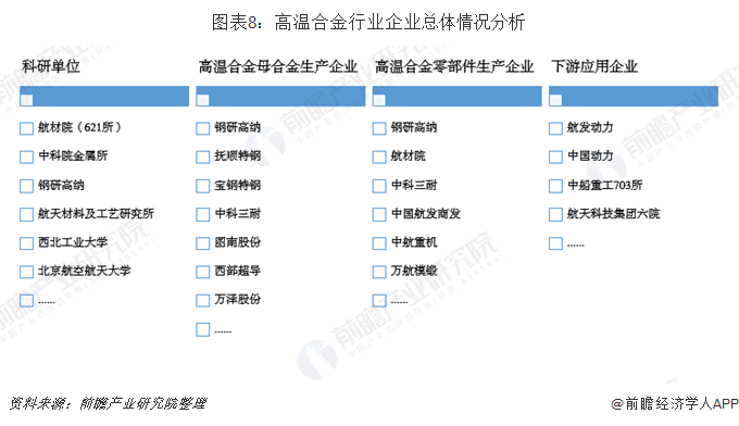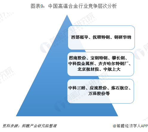 现阶段,我国高温合金行业的企业主要分为可研单位、高温合金母合金生产企业、零部件生产企业和下游应用企业几类。从生产领域看,由于行业进入的技术壁垒较高,因此我国高温合金行业形成了以钢研高钠、抚顺特钢、航材院、宝钢特钢等公司为代表的企业发展特征。