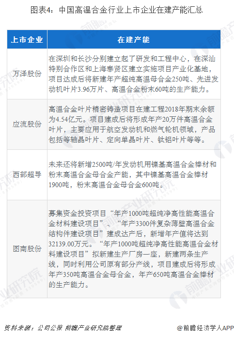 根据前瞻产业研究院不完全汇总,目前,中国高温合金行业主要生产企业产能合计20825吨/年。从生产企业产能排名来看,抚顺特钢的产能最大,达到5000吨/年,其次是钢研高纳的3000吨/年;宝钢特钢和长城特钢分别为1500吨/年,图南股份现有产能为1445吨/年;中科院金属所和北京航材院分别为1000吨/年和800吨/年。