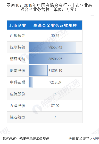 结合行业内上市企业高温合金业务营收来看,2018年,钢研高纳高温合金业务实现营收8.85亿元,排名第一;抚顺特钢高温合金业务实现营收7.86亿元,排名第二;图南股份高温合金业务实现营收3.18亿元,排名第三。值的注意的是,钢研高纳军品母合金国内市场占有份额超过40%。