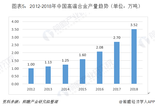 2017年,中国高温合金的产量已经达到2.7万吨,市场供给能力大幅提升,供给能力的提升使得高温合金产品的价格有所降低,打破了国外领先企业垄断国内市场的局面,加速了国产化进程。据测算,2018年,我国高温合金产量已经达到3.52万吨。