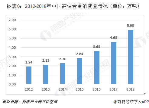 如今航空航天及高温合金材料行业相关重大科技项目已上升为国家战略。高温合金在主要领域需求不断增长,主要有:航空、汽轮机、核电、汽车等领域。据前瞻测算,2018年,我国高温合金消费量达到5.93万吨。