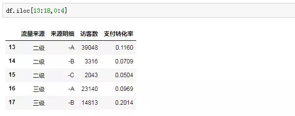 思路:先看行,二级三级渠道对应行索引是13:17,再次强调索引含首不含尾的原则,我们传入的行参数是13:18;列的话我们需要流量来源、来源明细、访客和转化,也就是前4列,传入参数0:4。