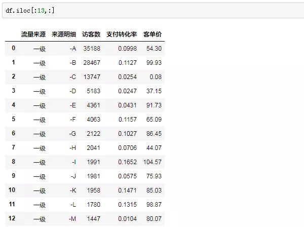 和第一篇数据集一样,记录着不同流量来源下,各渠道来源明细所对应的访客数、支付转化率和客单价。数据集虽然简短(复杂的案例数据集在基础篇完结后会如约而至),但是有足够的代表性,下面开始我们索引的表演。
