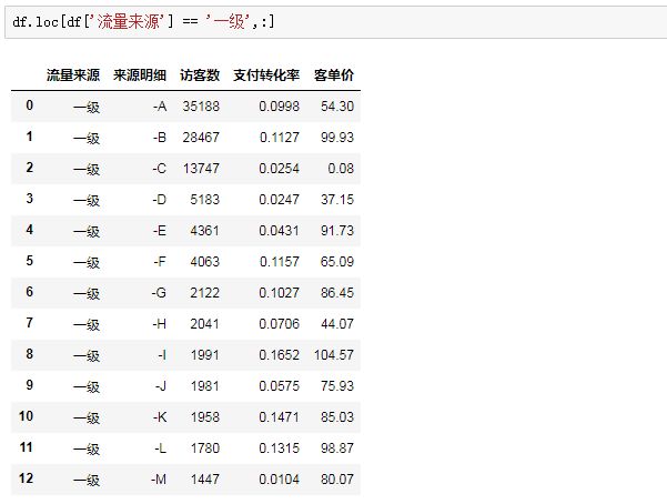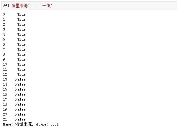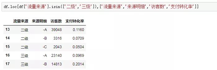 此处插播一条isin函数的广告,这个函数能够帮助我们快速判断源数据中某一列(Series)的值是否等于列表中的值。拿案例来说,df['流量来源'].isin(['二级','三级']),判断的是流量来源这一列的值,是否等于“二级”或者“三级”,如果等于(等于任意一个)就返回True,否则返回False。我们再把这个布尔型判断结果传入行参数,就能够很容易的得到流量来源等于二级或者三级的渠道。