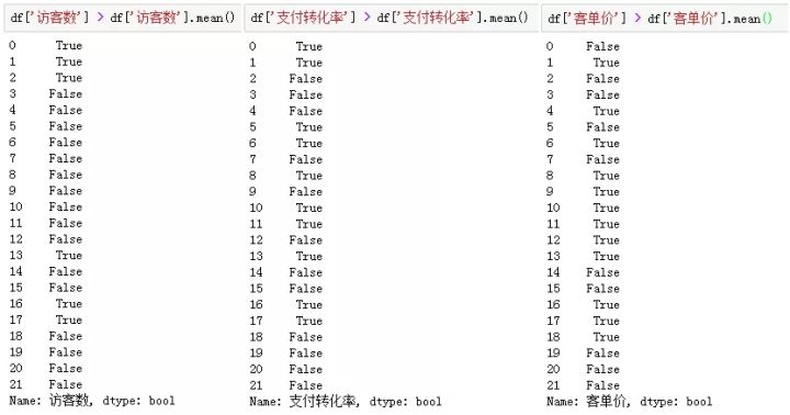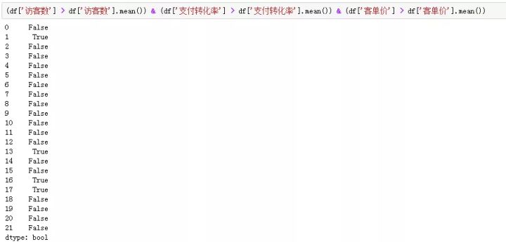 这样连接之后,返回True则表示该渠道同时满足访客、转化率、客单价都高于均值的条件,接下来我们只需要把这些值传入到行参数的位置。