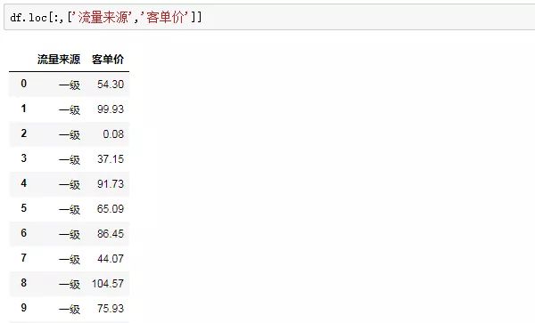思路:所有渠道等于所有行,我们在行参数位置直接输入“:”,要提取流量来源和客单价列,直接输入名称到列参数位置,由于这里涉及到两列,所以得用列表包起来: