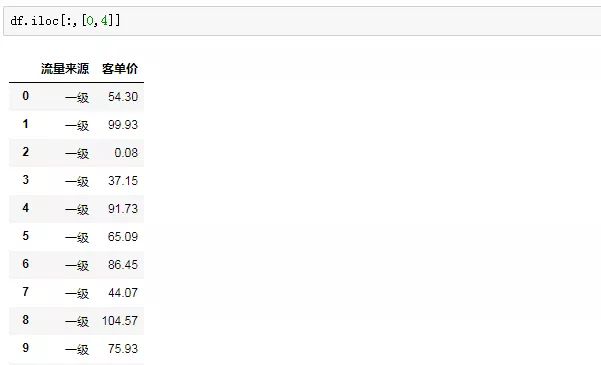 思路:所有流量渠道,也就是所有行,在第一个行参数的位置我们输入“:”;再看列,流量来源是第1列,客单价是第5列,对应的列索引分别是0和4: