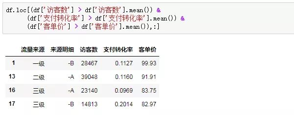 场景四:对于流量渠道数据,我们真正应该关注的是优质渠道,假如这里我们定义访客数、转化率、客单价都高于平均值渠道是优质渠道,那怎么找到这些渠道呢?