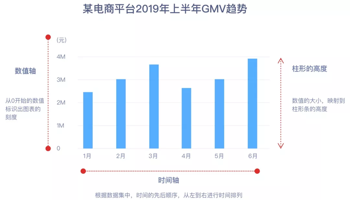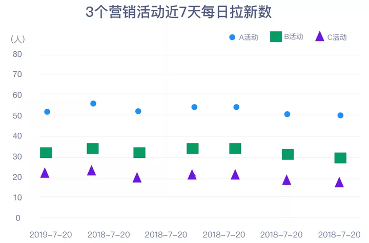 对于分布在离散时间的数据的可视化,可以采用柱状图、堆叠柱状图、散点图来表示,下面分别来看下三种图形来进行离散时间可视化的适用场景和不适用场景。