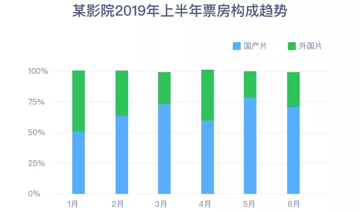 若影院想知道上半年各月,国产片和外国片的贡献占比随时间的变化情况,这个时候就可以使用百分比堆叠柱状图。