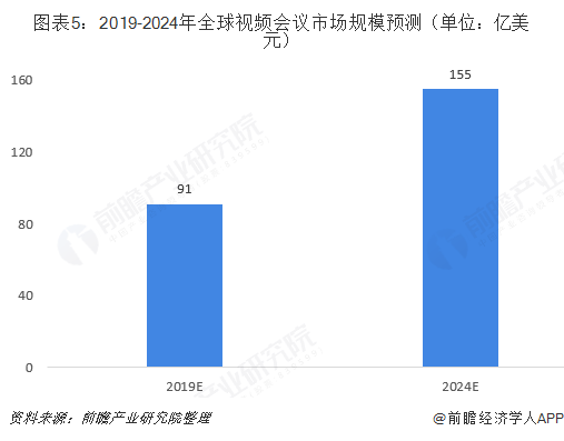 目前,全球市场范围内视频会议硬件产品如多点控制单元MCUs、编解码、外围设备等处于持续增长状态。而全球化促进跨国公司成长并提高其内部沟通频率,公司将工作场所转移至全球以便利用支持性政策和资源也拉动了各地员工的统一通信和协作需求。未来,随着新设备和智能云服务推动视频成为首选通信方式,2024年全球视频会议相关设备预计出货9800万台,视频会议市场规模预计达到155亿美元。