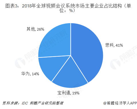 全球视频会议系统厂商主要有两种类型,一类为华为、宝利通,其用户主要为大型企业,另一类为包括公司在内的新型视频会议系统厂商,用户主要为中型企业。目前全球视频会议系统市场呈现寡头垄断的市场,市场集中度较高。根据IDC公布数据显示,华为、思科、宝利通占据了全球74%的市场份额,其中思科占比最高,为41%。