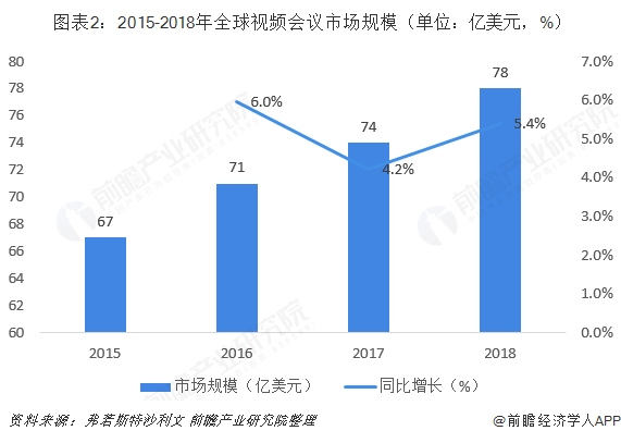 根据全球权威研究机构Frost&Sullivan统计,2018年度全球约出货3280万台视频会议相关设备、基础设施和云服务席位许可,全球视频会议行业规模约为78亿美元,增长了5.4%。