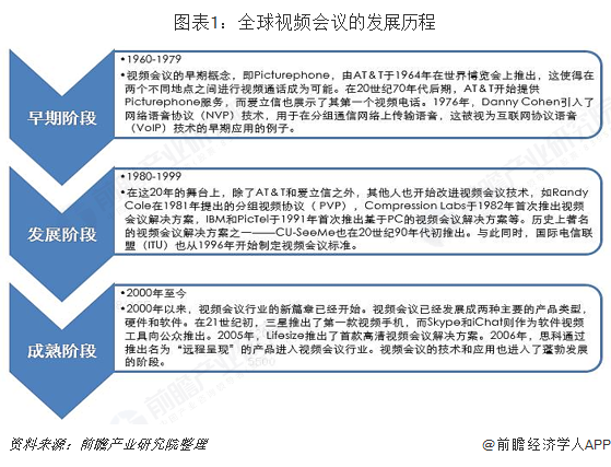 纵观视频会议系统行业的发展历史,目前国际厂商始终处于领先地位。由于通信行业本身的技术先进性、组网架构复杂性、互联互通的可靠性稳定性以及产业应用的低成本需求,必然导致技术突破是核心驱动力。整体来看,国际视频会议的发展大致可分为三个阶段,即可分为早期阶段、发展阶段和成熟阶段。