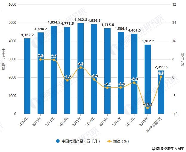 根据国家统计局数据,2009-2018年,中国啤酒产量总体上呈先上升后下降的趋势。中国啤酒产量在2013年达到顶峰,当年产量为4982.79万千升,同比增长4.3%。随后中国啤酒产量逐年下降,2018年中国啤酒产量下降至3812.20万千升,同比下降13.4%。截止至2019年1-7月全国啤酒产量达到2399.5万千升,同比增长0.3%。