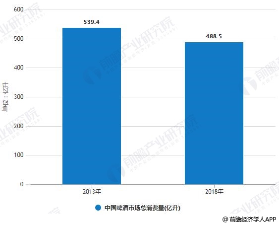 据Global Data数据显示,我国啤酒市场总消费量在2013年见顶达到539.4亿升,随后开始下滑,至2018年我国啤酒市场总消费量降至488亿升(包括大量小型区域性啤酒酿造商),但是仍然占全球啤酒总消费量的四分之一,是全球第一大啤酒消费市场。