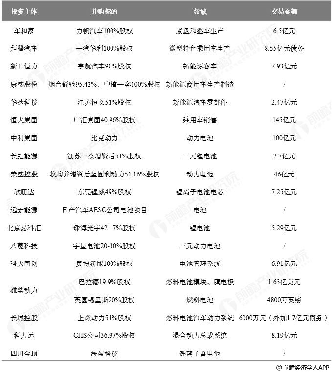 2018年中国新能源汽车行业兼并重组事件汇总情况