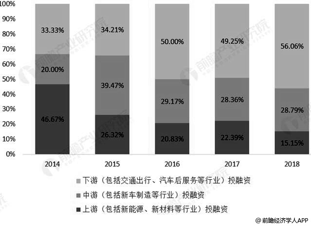 2018年中国新能源汽车行业投融资事件产业链上中下游项目占比统计情况