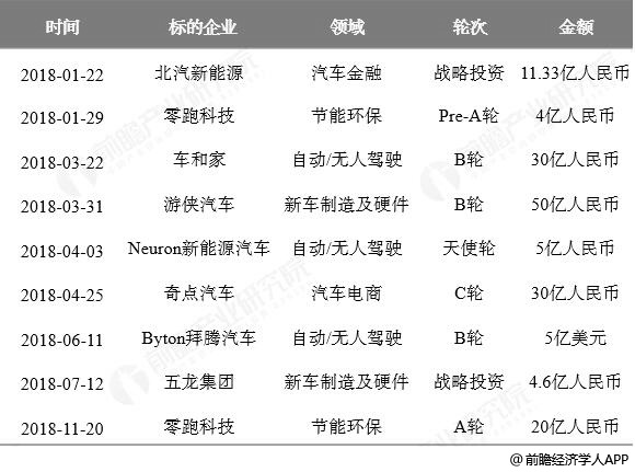 2018年中国新能源汽车行业部分重点投融资事件汇总情况