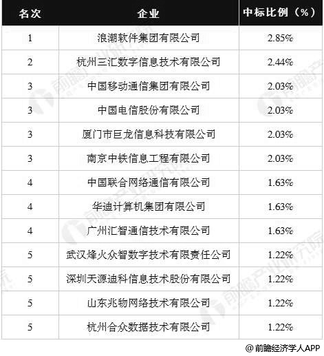 根据前瞻的统计,2016-2019上半年我国246个公安大数据建设项目中,中标供应商多达235家。其中,浪潮软件拔得头筹,总中标项目数量最多,占比达到2.85%。其次为杭州三汇,中标比例为2.44%。中国移动和中国电信中标数量一样,占比均为2.03%。而华为虽然直接中标项目不多,但是作为绝大多数中标企业的设备供应商间接参与了市场竞争。