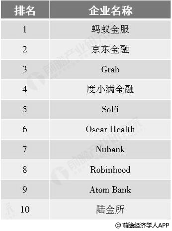 2018年全球金融科技企业TOP10统计情况