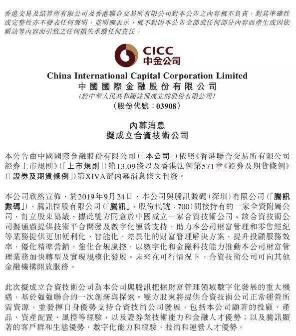 中金公司在公告中称,此次与腾讯拟成立合资技术公司是响应国家和监管部门发展金融科技的号召及要求,把握财富管理领域数字化发展的重大机遇,基于强强联合的一次创新与探索。