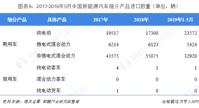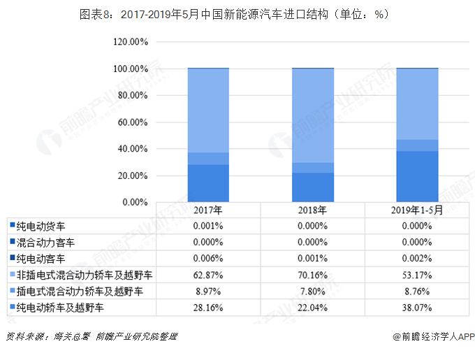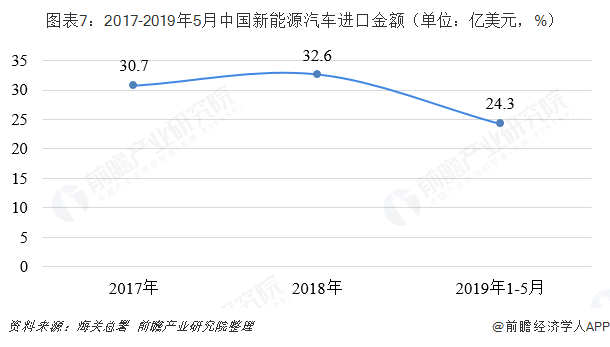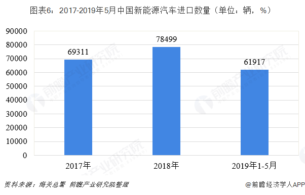 根据中国海关统计,我国新能源汽车进口规模呈扩大趋势。2018年全年进口新能源汽车7.8万辆,同比增长13.25%;在进口金额方面,2018年我国新能源汽车进口金额为32.6亿美元,同比增长6.29%。截至2019年5月,我国新能源汽车进口累计达到6.19万辆,进口金额合计24.3亿美元。